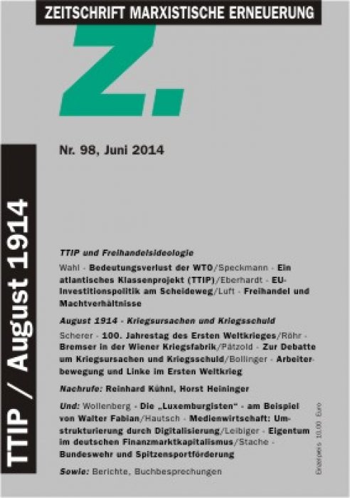 Im August jährt sich der Beginn des Ersten Weltkriegs zum hundertsten Mal. Von vielen Marxisten (etwa Friedrich Engels und August Bebel) seit langem befürchtet, war der „Große Krieg der weißen Männer“ (Arnold Zweig) Ausdruck der wachsenden zwischenimperialistischen Konkurrenz zwischen den kapitalistischen Hauptländern. Wenn sich „Z“ im vorliegenden Heft in einem Schwerpunkt den Ereignissen zwischen 1914 und 1918 zuwendet, so auch deshalb, weil der Erste Weltkrieg in der Erinnerungsdebatte der BRD erneut zum Politikum geworden ist. Peter Scherer rekapituliert in seinem Beitrag den Verlauf des Krieges. Hierbei geht er nicht nur auf die zentralen Ereignisse und das Versagen der Arbeiterparteien ein, sondern zeichnet anhand von Quellen auch die psychischen Wirkungen des Krieges auf einzelne Soldaten und ihre an der Heimatfront verbliebenen Nächsten nach. Eingeleitet und kommentiert durch Werner Röhr dokumentieren wir erstmals die Tagebuchblätter des Sektionsrates im Wiener Außenministerium Friedrich Wiesner, der während der „Julikrise“ als Experte für strafrechtliche Fragen Mitglied der Kommission zur Untersuchung des Attentats auf den österreichischen Thronfolger war und in dieser Funktion als „Bremser“ in Konflikt zu den Kriegstreibern geriet. Dem gegenwärtigen „Historikerstreit“ zur Kriegsschuldfrage widmet sich der Beitrag Kurt Pätzolds, der bis in die Analyse von Schulbüchern nachzeichnet, wie deutsche Selbstentlastungsversuche die Debatte bestimmen. Christopher Clarks Versuch einer Revision der Arbeit Fritz Fischers fällt, wie Pätzold nachzeichnet, in der Bundesrepublik somit auf den fruchtbaren Boden einer Geschichtswissenschaft, die zunehmend versuche, struktur- und gesellschaftsgeschichtliche Zusammenhänge zugunsten reiner Ereignis- und Diplomatiegeschichte zu verdrängen. Stefan Bollinger analysiert in seinem Beitrag detailreich die Rolle der deutschen Arbeiterbewegung und ihrer Organisationen vor und im Ersten Weltkrieg. Hierbei behandelt er sowohl das Verhalten des SPD-Parteivorstands im Wechselspiel mit der Reichsregierung als auch die Reaktionen der Basis während des Beginns, des Verlaufs und des Endes des Krieges. Die Gründe des historischen Versagens kommen ebenso zur Sprache wie jene Momente des Widerstands, die schließlich zur Spaltung der Sozialdemokratie führten.