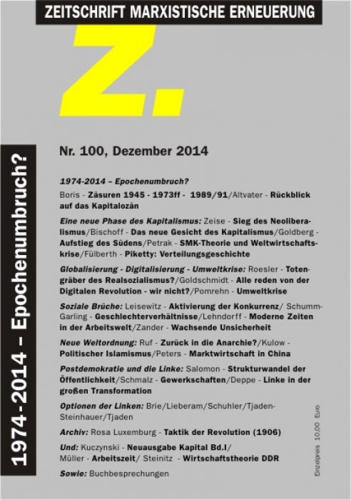Haben wir es mit einem „Epochenbruch“ zu tun? Ist die Periode nach 1973, wie Eric Hobsbawm meint, als „Erdrutsch“ zu bezeichnen, oder müssen wir nicht eher von einem „Kompositum von Kontinuitäts- und Diskontinuitätsmomenten“ sprechen? Dieter Boris zeigt, dass es keine allgemeingültigen Kriterien für die Periodisierung von historischen Prozessen gibt, dass sachliche Ebenen und Zeithorizonte unterschieden werden müssen. Erst aus der Gewichtung der verschiedenen Momente heraus plädiert er für die These des „Bruchs“. Für Elmar Altvater sind die 1970er Jahre der entscheidende Einschnitt: Mit dem Ende des Systems von Bretton Woods beginnt der Siegeszug des Finanzmarktkapitalismus. Gleichzeitig kündigte, angestoßen durch den Bericht des ‚Club of Rome’ von 1972, die Bewusstwerdung des Zusammenhangs zwischen Geld- und Kapitalform einerseits und Naturalform andererseits ein „neues Erdzeitalter“ an, das „Kapitalozän“, als „Einheit von kapitalistischer Gesellschaftsformation und … planetarischer Naturalform“. Auch Lucas Zeise wertet die 1970er Jahre als Epochenbruch, wobei er die Veränderung der Kräfteverhältnisse zwischen Kapital und Arbeit als Kern des Neoliberalismus in den Mittelpunkt stellt.