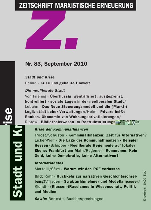 Während die Finanzmärkte weiter am Tropf des Staates hängen, feiern im ideologischen Bereich neoliberale und marktradikale Erklärungsmuster fröhliche Urständ. Zarte Hoffnungen auf eine ‚Keynesianische Wende’ der Wirtschaftspolitik nach der nur dank massiver Staatsinterventionen überdeckten Krise erweisen sich als unbegründet. Die neoliberalen Umverteilungsbemühungen gehen verstärkt weiter. Dies zeigen die Beiträge im Schwerpunkt des vorliegenden Heftes „Stadt in der Krise“. Die hier versammelten Beiträge von marxistisch orientierten Stadtforschern aus Soziologen, Geographie und Ökonomie beschäftigen sich einerseits mit der „neoliberalen Stadt“, andererseits mit der Krise der Kommunalfinanzen. Die kommunale Ebene ist von besonderer Bedeutung für die Situation der abhängigen Bevölkerung, weil dort die täglichen Lebensbedingungen bestimmt werden. In Städten und Gemeinden entfalten relativ abstrakte finanzwirtschaftliche Eckdaten – wie Steuerquoten und Verschuldungsgrade – ihre soziale Wirkung. Dieser Zusammenhang erschließt sich allerdings nicht auf den ersten Blick: Während die große Mehrheit der Bevölkerung Staatsverschuldung als Übel betrachtet und die nun verfassungsmäßig verankerte „Schuldenbremse“ begrüßt, gilt dies sicher nicht für den daraus resultierenden massiven Abbau der kommunalen Dienstleistungen.