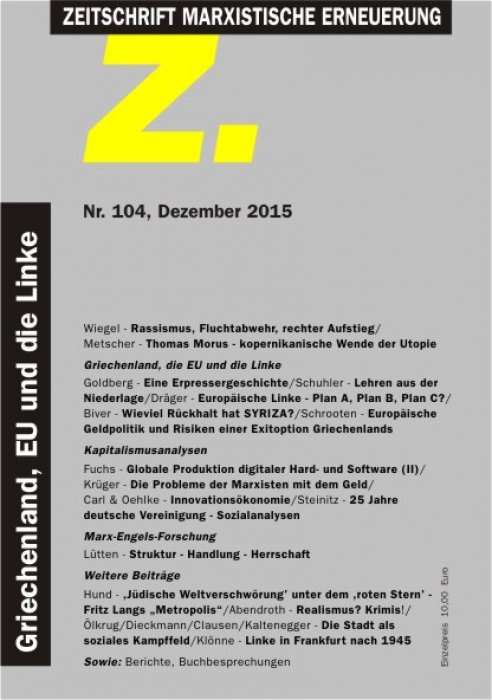 Weitere Beiträge: John Lütten setzt sich mit einer im Rahmen der ‚neuen Marxlektüre‘ verbreiteten Lesart von Marx‘ Kritik der politischen Ökonomie auseinander, der zufolge Marx im „Kapital“ eine subjektlose, unpersönliche Form bürgerlicher Herrschaft beschrieben habe. In dieser ‚verselbständigten‘ Form von Herrschaft sind Individuen und gesellschaftliche Klassen lediglich bewusstlose Exekutoren ökonomischer Funktionen ohne Handlungsoptionen. Lütten zeigt, dass diese Position den dialektischen Zusammenhang von Struktur und Handlung verkennt. Zudem sei sie „anschlussfähig“ an neoliberale Sichtweisen, denen zufolge die Gesetze der Finanzmärkte jede Handlungsmöglichkeit determinieren. Elisabeth Abendroth zeichnet anhand von Jan Seghers‘ „Sternthalerverschwörung“ und Gila Lustigers Roman „Die Schuld der Anderen“ nach, wie der gegenwärtige Kriminalroman als gleichermaßen gesellschaftsanalytisches wie politisches Medium fungiert. Der Diskussion um Realismus in der Gegenwartsliteratur (vgl. Z. 101) steht sie eher skeptisch gegenüber, sei hier doch „ästhetische Reglementierung“ zu befürchten. Wulf D. Hund arbeitet in seinem Betrag detailreich heraus, wie sich in Fritz Langs Stummfilmklassiker „Metropolis“ antisemitische, rassistische und antikommunistische Ikonographien und Motive überlagern. Gegen Interpretationen, die in „Metropolis“ eine linke, gar sozialistische Utopie sehen wollen, zeigt Hund, dass es letztlich ein Ideal der Volksgemeinschaft ist, das in Metropolis utopisch inszeniert wird. „Die Stadt als soziales Kampffeld“ war Thema der „Marxistischen Studienwoche“ vom März 2015. Wir dokumentieren vier Beiträge von Patrick Ölkrug (Stadtentwicklung und Austeritätspolitik in Portugal), Sophie Dieckmann (Wohnungspolitik in der VR China), Matthias Clausen (Berliner Initiative „Kotti & Co“) und Ernest Kaltenegger (Linke Wohnungs- und Stadtpolitik in Graz). Zur Erinnerung an Arno Klönne veröffentlichen wir einen Brief von ihm mit einem Kommentar zum linken Milieu der 1950er und 1960er Jahre im Frankfurt er Raum: „Das hat es sonst in dieser Weise damals in Westdeutschland nirgendwo gegeben.“