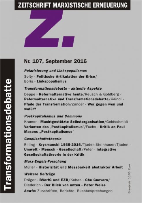 Postkapitalismus und Commons: Die anhaltenden Krisenerscheinungen stärken jenseits der Debatte über Reformstrategien Positionen, die von Entwicklungen innerhalb des Kapitalismus systemüberwindende Effekte erwarten. Die Beiträge zum Thema „Postkapitalismus und Commons“ eröffnet Dieter Kramer mit einer Skizze zur Geschichte des „Gemeinnutzens“. Er versteht unter Commons „gemeinschaftlich besessene, geteilte oder genutzte Ressourcen“. Heute könnten progressive Entstaatlichung und Gemeinnutzen zusammengedacht werden. Werner Goldschmidt behandelt im ersten Teil seines Literaturberichts – der zweite Teil erscheint in Z 108 – die Positionen nichtmarxistischer Autoren zur erhofften Zukunft der Commons ohne Kapitalismus. Immanuel Wallerstein betont die Schwierigkeiten des Übergangs zu einer nachkapitalistischen Gesellschaft, Wolfgang Streeck warnt, dass sich der Kapitalismus zunehmend desorganisiert, ohne dass an seine Stelle etwas Besseres tritt. Jeremy Rifkin und Paul Mason erwarten die Transformation als Folge der wachsenden Bedeutung digitalisierter Informationen, die nicht kapitalistisch verwertet werden könnten. Anders als Goldschmidt sieht Christian Fuchs in Paul Masons Thesen einen Technikdeterminismus am Werk, der aus der Informationstechnologie „Null-Grenzkosten von Information“, einen tendenziellen Fall der Profitrate und den Zusammenbruch des Kapitalismus ableitet. Fuchs erinnert an ähnliche Prognosen von Theoretikern der II. Internationale, denen zufolge der Kapitalismus an fehlenden Verwertungsmöglichkeiten scheitern würde.