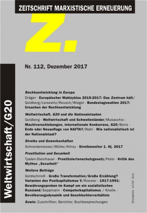Weltwirtschaft, G20 und die Nationalstaaten: Die Weltwirtschaft blickt auf eine seit 2010 anhaltende konjunkturelle Aufwärtsbewegung zurück, die sich wohl auch im kommenden Jahr fortsetzen wird. Jörg Goldberg verweist auf drei Unsicherheitsmomente: In den entwickelten Ländern stagnieren die Investitionen trotz (oder wegen?) der Digitalisierung. Die Expansion der Schwellenländer setzt sich fort, Ungleichgewichte verweisen auf eine zunehmende Fragilität des Aufstiegsprozesses. Auf den boomenden Finanzmärkten wächst die Angst vor den Folgen des möglichen Abschieds der Notenbanken von der expansiven Geldpolitik.