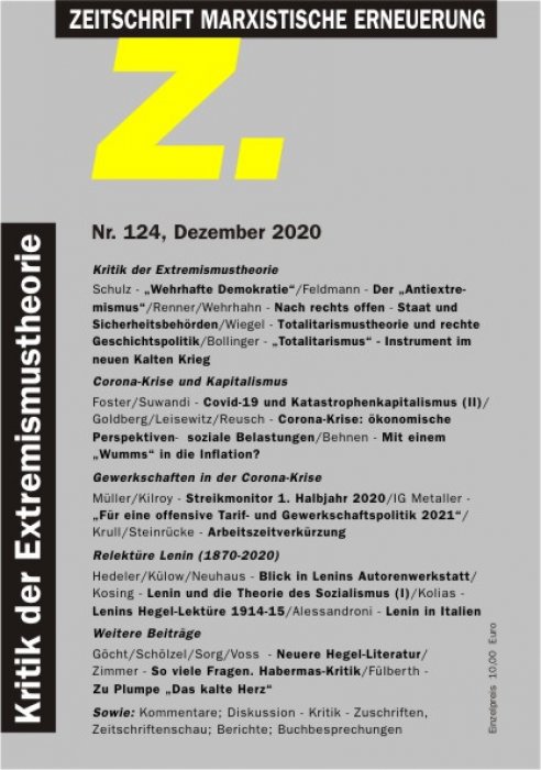 Aus der Redaktion: Die Heftpräsentation von Z 124 (Zoom-Meeting) findet am 14. Dezember, 19 Uhr, statt. Thematisch wird es um den Schwerpunkt „Kritik der Extremismustheorie“ gehen. Hier schon der zugehörige Link: https://us02web.zoom.us/j/83533077045. Weitere Informationen zur Heftpräsentation sind der Z-Homepage zu entnehmen. Z 125 (März 2021) wird sich u.a. mit der Kritik des kapitalistischen Gesundheitswesens befassen. Thema der „Marxistischen Studienwoche“ 2021 (15.-19. März 2021): „Formwandel des Kapitalismus und die Rolle von Krisen“ (Näheres S. 145).