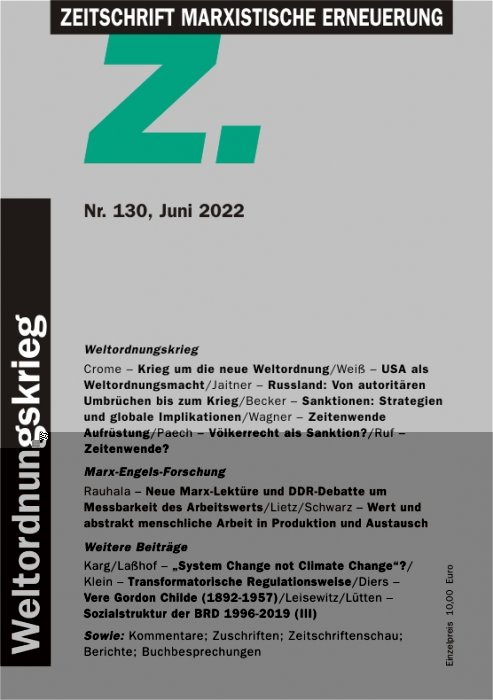 Marx-Engels-Forschung: Wir setzen die in Z 125 begonnene Diskussion über die werttheoretischen Auffassungen von Michael Heinrich und der sog. Neuen Marx-Lektüre fort. Paula Rauhala gibt einen Überblick zu der um 1960 in der DDR geführten Debatte über die Messbarkeit des Arbeitswerts. Sie zeigt, dass die dem „traditionellen“ Marxismus oft unterstellte substanzialistische Wertauffassung und naturalistische Interpretation der abstrakten Arbeit damals keineswegs vorherrschte. Heinrich hatte in Z 129 auf seine Kritiker geantwortet. Barbara Lietz und Winfried Schwarz unterstreichen in ihrer Replik, dass Wert und abstrakt menschliche Arbeit nicht erst aus dem Austausch resultieren. Der Wert ergibt sich aus Produktion und Austausch im Sinne der Einheit von Wert in der Produktion und Wertform im Austausch. Ferner weisen sie Heinrichs Ansicht zurück, dass erst der Austausch die konkrete Arbeit auf abstrakte reduziere. Abstrakt menschliche Arbeit bildet in der Warenproduktion von vornherein den spezifisch gesellschaftlichen Charakter der Privatarbeiten, den der Austausch nicht herstellt, sondern realisiert. Herbert Rünzi und Klaus Müller tragenmit ihren Zuschriften zu der Debatte bei. Beide unterstreichen, dass Wertbildung in der Produktion stattfindet und diskutieren die Beziehung zwischen Wertgröße und gesellschaftlich notwendiger Arbeitszeit.