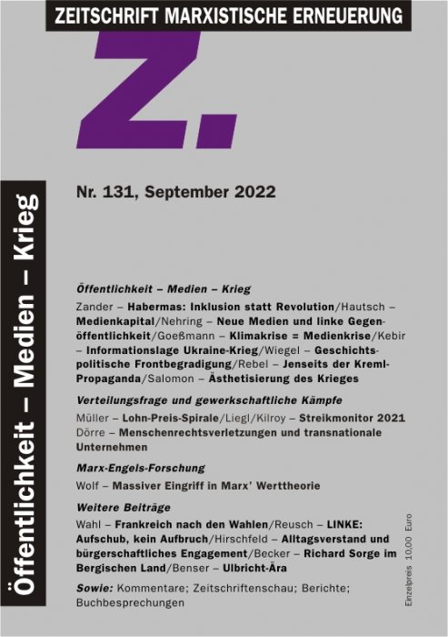 Es sind zwei Themen, die die aktuellen politischen Auseinandersetzungen in der Öffentlichkeit in hohem Maße bestimmen: Einmal der Krieg in der Ukraine und die zunehmenden internationalen Spannungen; dann die Inflation und die Angst vor wachsenden sozialen Belastungen im Herbst und Winter, für die der gegenwärtig zu beobachtende Einbruch der (inflationsbereinigten) Einzelhandelsumsätze ein deutlicher Indikator ist. Diese Themen werden in der Öffentlichkeit medial vermittelt verhandelt. Wie funktioniert diese Öffentlichkeit heute, wer bestimmt, wie die Themen verhandelt werden, welche Chancen haben soziale Bewegungen und Linke, sich dabei Gehör und Kommunikationsräume zu verschaffen? Das sind Fragestellungen des Schwerpunkts „Öffentlichkeit – Medien – Krieg“, aber auch, auf andere Weise, des zweiten Themenbereichs „Verteilungsfrage und gewerkschaftliche Kämpfe“, in dem es um Herrschaftsideologie („Lohn-Preis-Spirale“) und um soziale Bewegungen (Streikentwicklung 2021) geht. In der Kommentar-Spalte unterstreicht Frank Deppe die Aufgaben, vor die die sozialistische Linke jetzt gestellt ist – Entwicklung einer wirkungsvollen Antikriegs- und Antikrisenpolitik; Ulrike Obermayr verweist auf anstehende gewerkschaftliche Kämpfe, Gerd Wiegel zeigt, wie die politische Rechte die wachsenden sozialen Belastungen instrumentalisieren will.