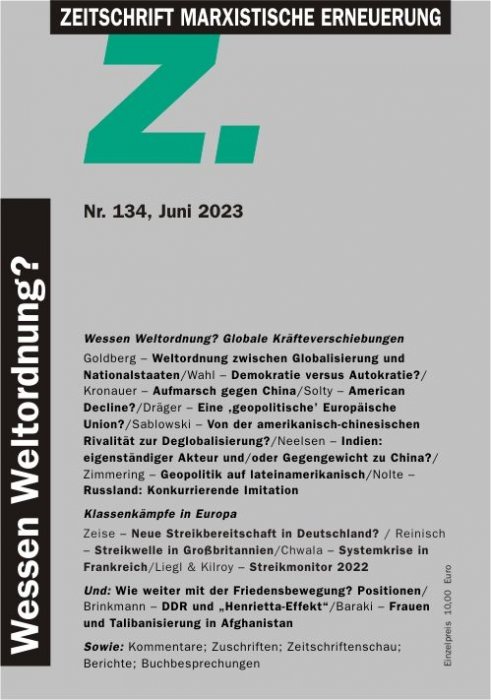 Insgesamt zeigen sich nicht nur im weltwirtschaftlichen, sondern auch im globalpolitischen Bereich deutliche Kräfteverschiebungen, die die Gefahr weiterer militärischer Eskalationen in sich bergen. Die damit verbundene internationale Militarisierung ist Thema in Z 135 (September 2023).