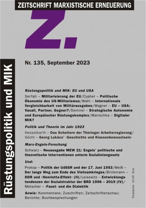 Aus der Redaktion: Herzlich zu danken ist Frank Walensky, der mit energischem Einsatz der Redaktion bei der Umstellung auf ein neues Layoutprogramm und der Überarbeitung des Layouts der Zeitschrift auf die Sprünge geholfen hat. Unbeschadet dessen gehen etwaige im Heft noch vorkommende Ungenauigkeiten zu Lasten der Redaktion. Heft 136 (Dezember 2023) wird in Aufnahme der Vorträge und Diskussionen bei der »Marxistischen Studienwoche« im August dieses Jahres Aspekte der aktuellen Multi-Krise behandeln.