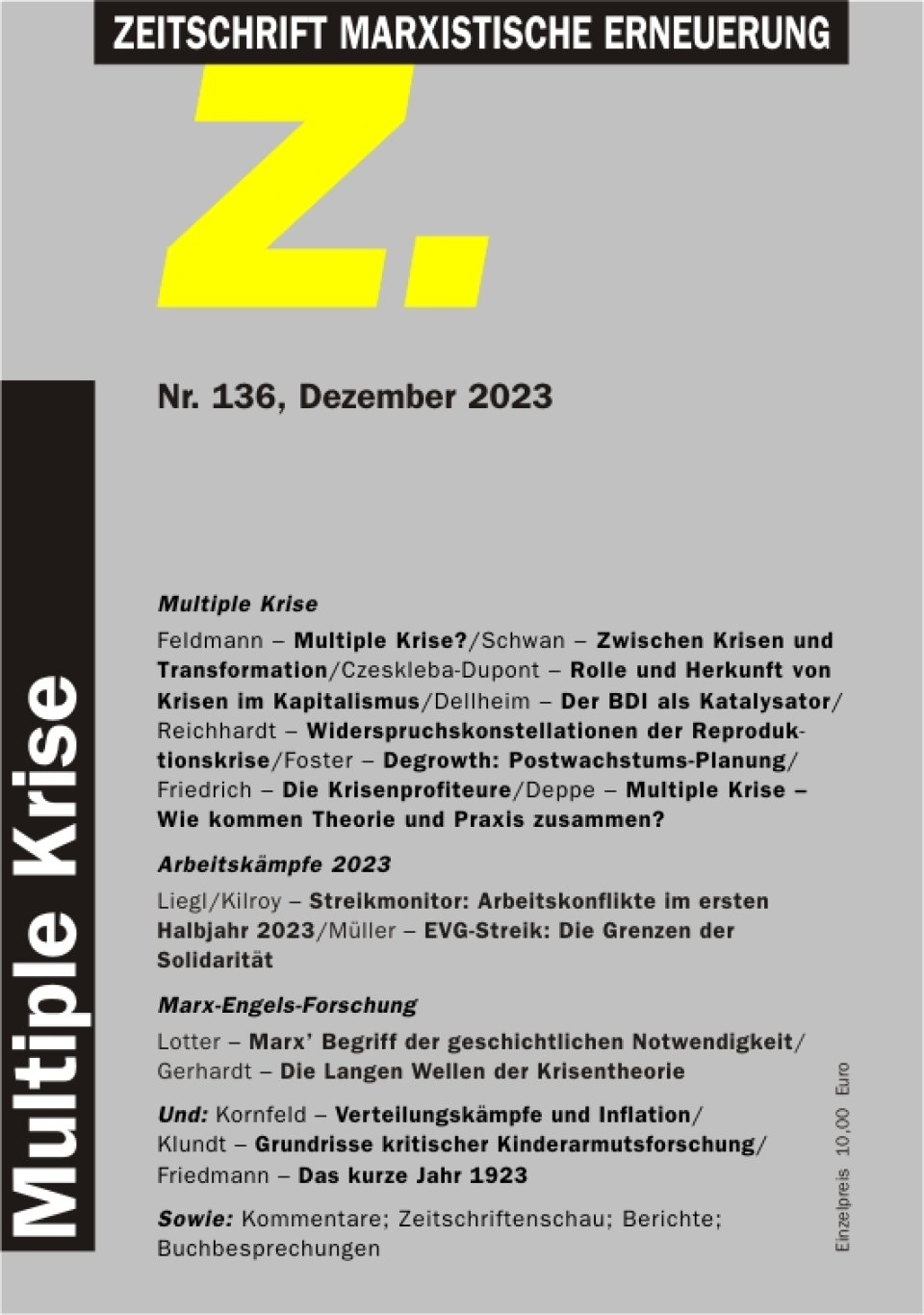 Marx-Engels-Forschung: Konrad Lotter lotet unterschiedliche Bedeutungsdimensionen des Begriffs der »Notwendigkeit« bei Marx aus – als Gegenbegriff zur Freiheit und als Gegenbegriff zum Zufall. Im Zentrum von Lotters Überlegungen steht dabei insbesondere das Verhältnis von Notwendigkeit und Gesetzlichkeit und dessen Implikationen für ein materialistisches Geschichtsverständnis. Timm Graßmanns auf der Grundlage der MEGA vorgelegtes Buch zu Marx‘ Forschungen zur Krisenentwicklung diskutiert Sebastian Gerhard vor dem Hintergrund der krisentheoretischen Problemlagen. Weitere Beiträge: Im Kontext sich zuspitzender Verteilungskonflikte spielt die Inflation derzeit eine zentrale Rolle. Malte Kornfeld zeigt, dass es zwar einen empirischen Zusammenhang zwischen Löhnen und Preisen gibt, dass aber die gängigen, mit der Kategorie der Lohn-Preis-Spirale arbeitenden Erklärungen zu kurz greifen. Entscheidend für den Zusammenhang seien die jeweiligen Kräfteverhältnisse zwischen Kapital und Arbeit. Die heftigen Auseinandersetzungen um die von der Ampelkoalition zurückgestutzten Pläne zur Kindergrundsicherung haben die Debatten zum Thema Kinderarmut in Deutschland befeuert. Michael Klundt zeigt in seinem Beitrag, wie auch von Teilen der Wissenschaft und Publizistik reale Armut begrifflich und mit veränderten Berechnungsmethoden unsichtbar gemacht werden soll. Ronald Friedmann lässt in einem konzentrierten Aufsatz die Ereignisse und Konflikte des Jahres 1923 zwischen Ruhrbesetzung, weitgehend ausgefallenem »Deutschen Oktober«, Hitlerputsch und Einführung der Rentenmark, die faktisch die Hyperinflation beendete, Revue passieren.